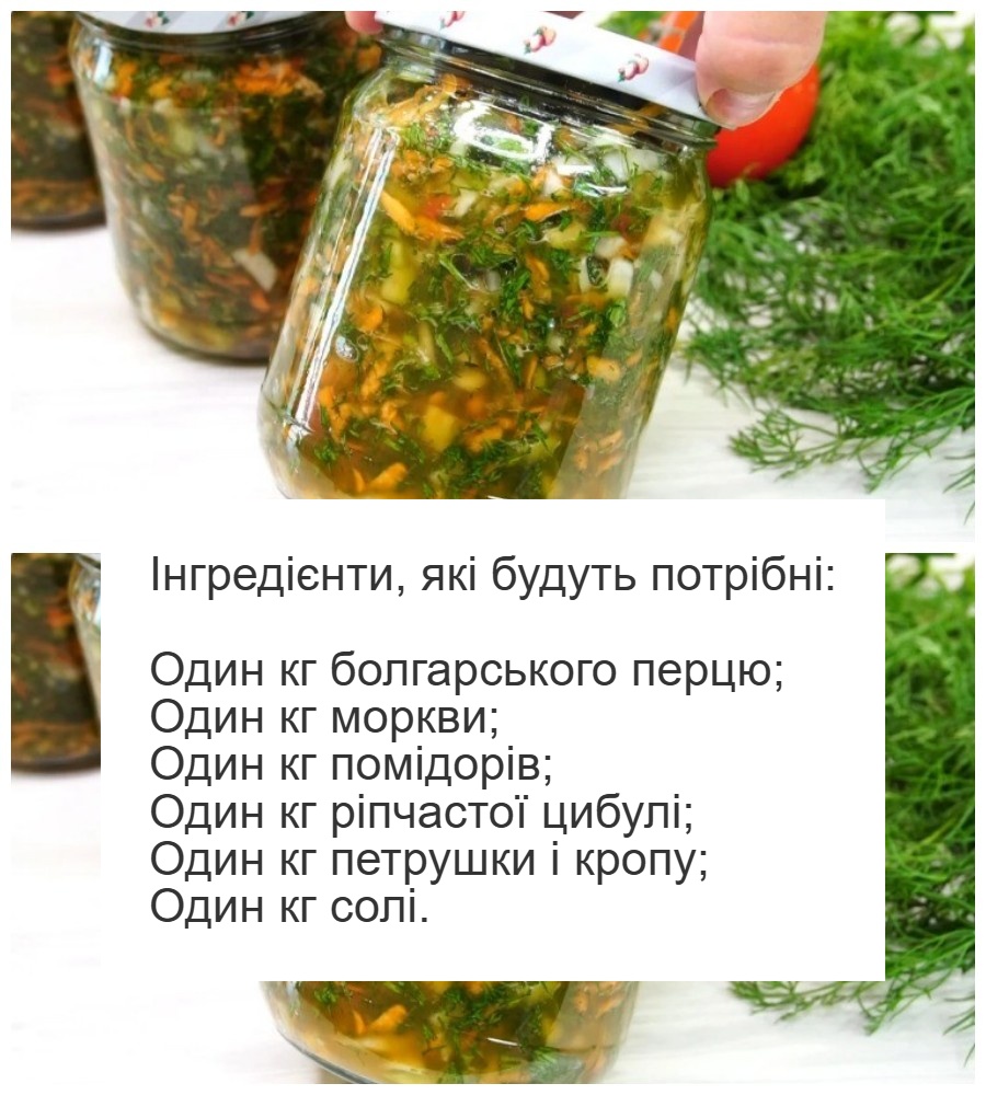 Відмінний рецепт, яким я хочу поділитися з вами. Дуже взимку зручно – дістала баночку, відкрила і поклала заправку в бульйон. Готується вона зі свіжих овочів і досить просто: нічого не потрібно кип’ятити, стерилізувати, варити, ніякого оцту і закатування банок. Всі овочі ріжуться, змішуються і розкладаються по банках. Зберігати краще в прохолодному місці, але я в минулому році провела експеримент – залишила одну банку при кімнатній температурі і нічого страшного не сталося.