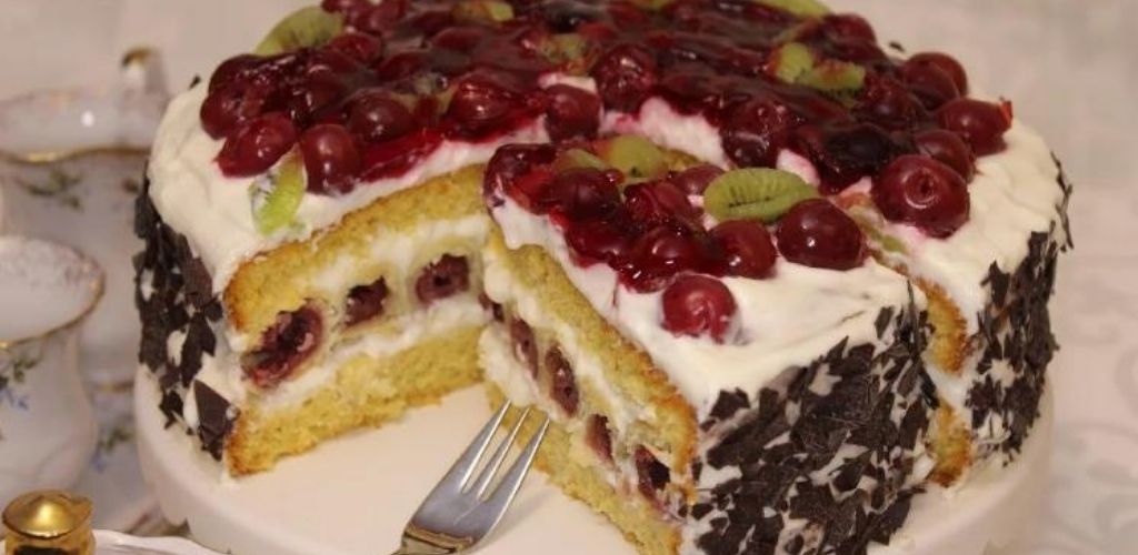 11. Бока торта присипати шоколадною стружкою, а зверху викласти консервовані вишні (заздалегідь зливши з них сік в окрему ємність) і шматочки ківі.