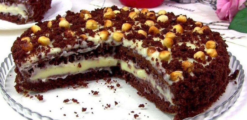 - Приготований раніше шоколадний корж розрізається навпіл, на нижній корж викладають крем, і закривають все верхнім – і ставлять отримане в холодильник до повного застигання години на три.