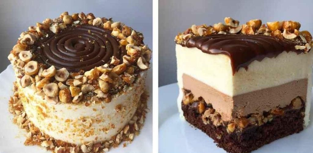 - На дно форму 16 см. помістити бісквіт, зверху відсадити спіраль карамелі, посипати 1/3 подрібнених карамелізованих горіхів, залити мусом з молочного шоколаду.