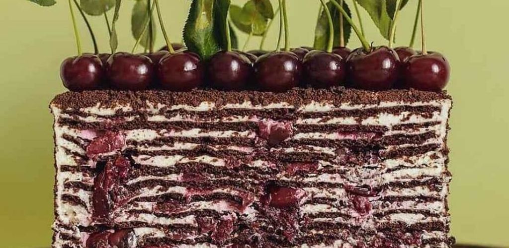 - Збірка торта. Вишні відкинути на сито, щоб зайва рідина скла. Її, до речі, можна використовувати для просочення бісквітних тортів. Кожен корж промазати двома столовими ложками крему і рівномірно розкласти вишні. Якщо збираєтеся обсипати торт крихтою з обрізків, краще промащувати тільки 13 коржів, а останній додати до обрізків, щоб вистачило.