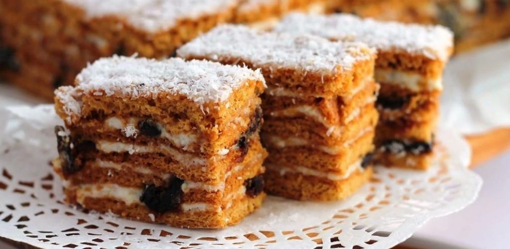 - Формуємо торт, змащуючи коржі кремом і посипаючи шматочками чорносливу, родзинками і горіхами.